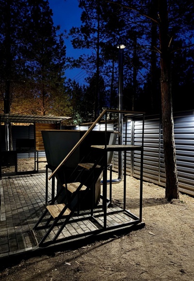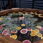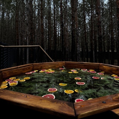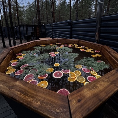 На территории каждого дома расположен банный чан, наполненный горячей водой. Для более глубокого погружения в атмосферу спокойствия мы предоставляем услугу по украшению банного чана пихтой с цитрусами.